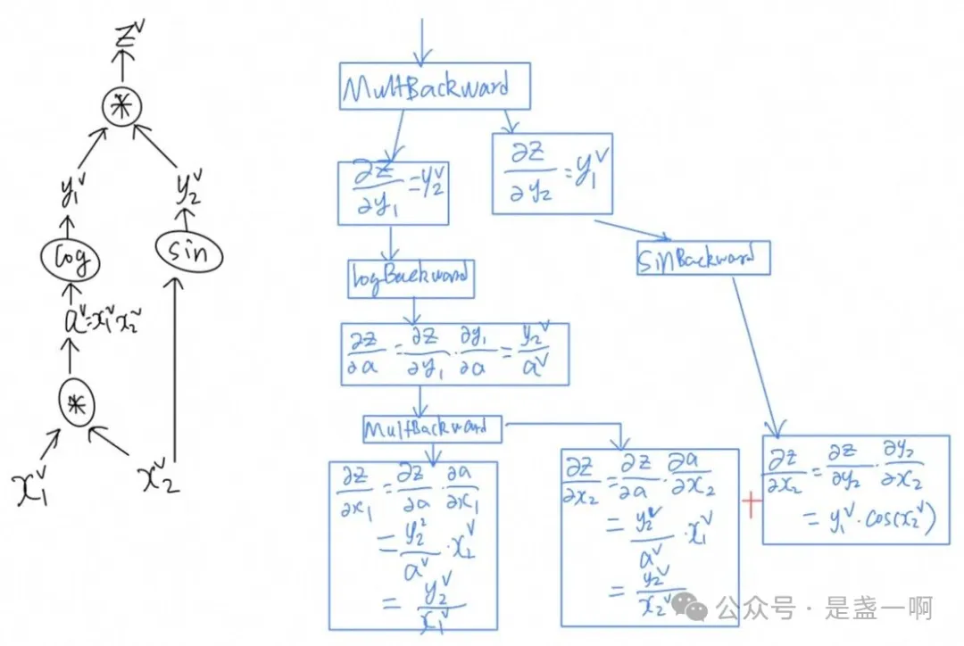 最让我惊奇的是 $\frac{\partial z}{\partial x_2}$ 的计算, 这个是由两个不同的来源产生的; 在 pytorch 中, 当两个不同的函数共享同一个输入时, 针对该输入的关于输出的梯度会被累加起来; 在所有路径的梯度没有全部聚合完成之前, 使用该梯度进行的计算是无法继续的.